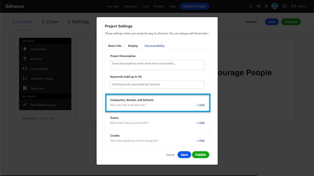 Before you publish your Behance project, you should set up the information which relates to your project.