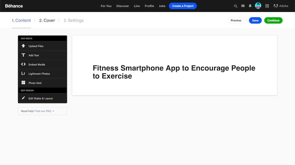 Behance has a user-friendly editor for you to create your UX case study. Start by typing your UX project’s title. For our example, we’ve created the title “Fitness Smartphone App to Encourage People to Exercise” in line with the Design Thinking Portfolio project.