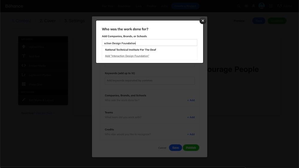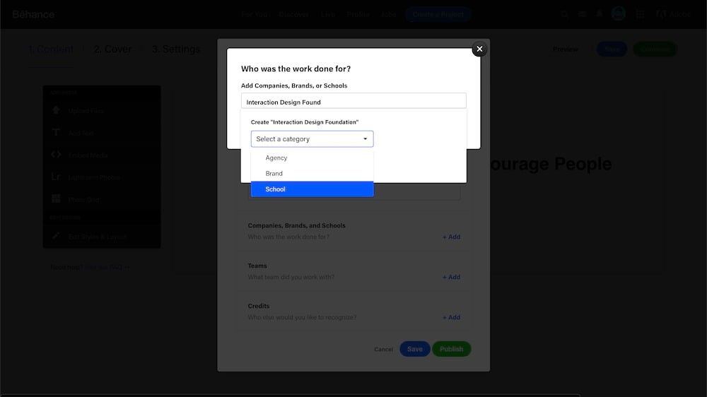 Type “Interaction Design Foundation” to add us as a school for which you’ve created the project. Author/copyright holder: Behance. Copyright terms and license: Fair Use.
