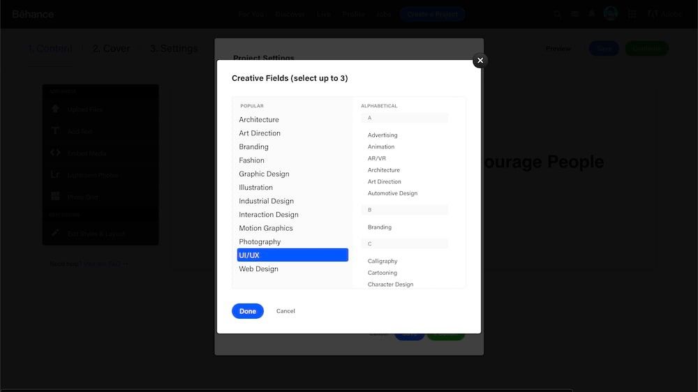 Select the “UI/UX” creative field to ensure your Behance project appears in the right category. Author/copyright holder: Behance. Copyright terms and license: Fair Use.