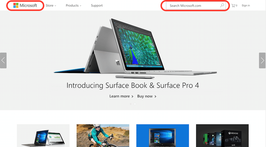 Both Microsoft and Apple place their logo on the top left, and the search field on the top right of their websites. This form of consistency in layout helps users feel less disoriented when they browse a new and unfamiliar site.