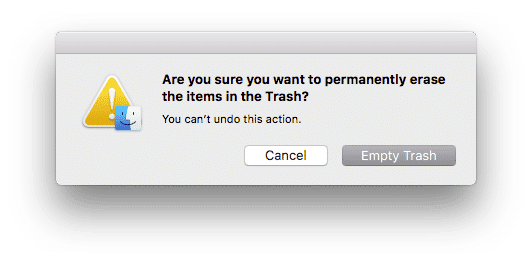 The OSX “empty trash” warning dialog protects the user from an irreversible action. Copyright: the Author.