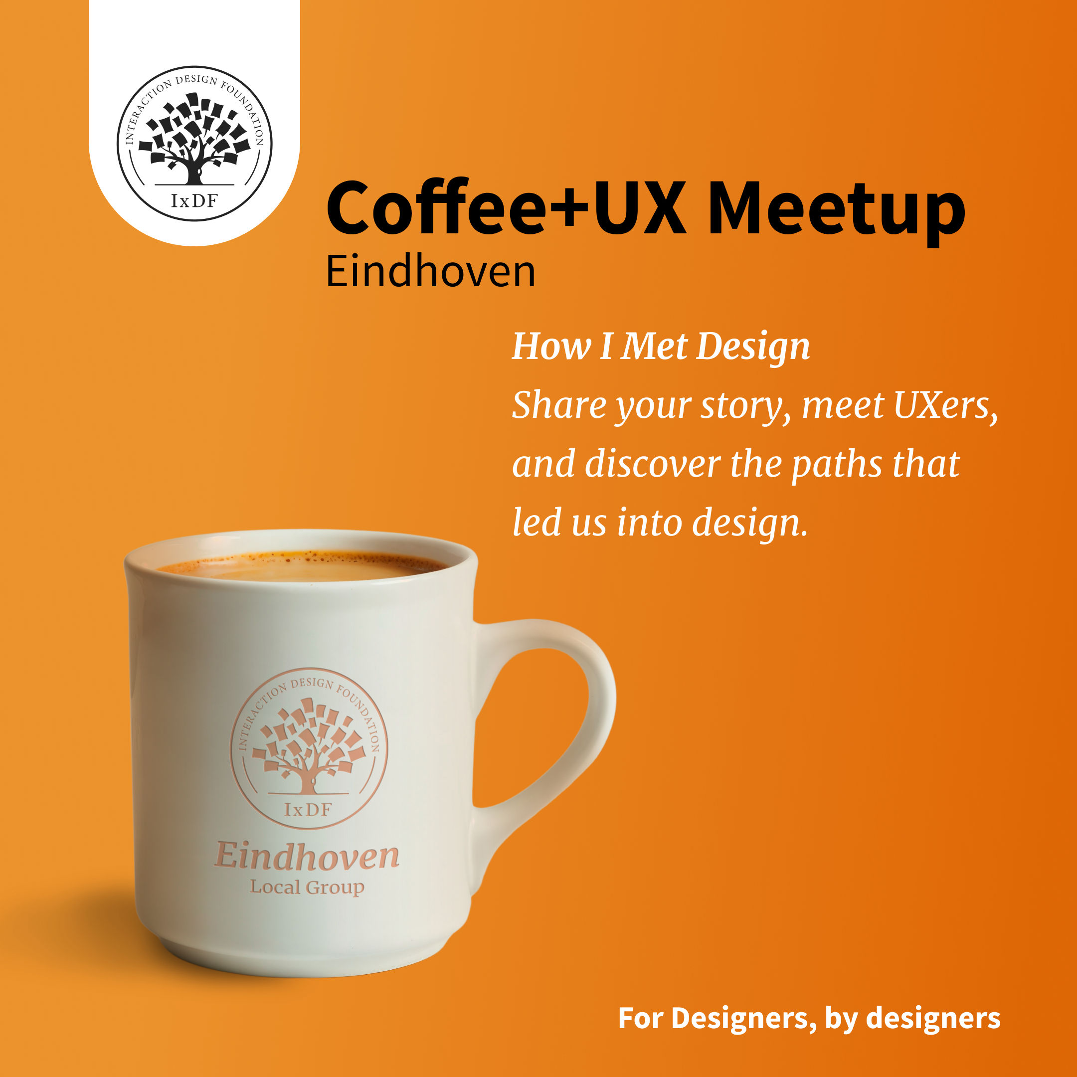 Hi IxDF Eindhoven, let’s meet up and network over coffee! It’s going to be an informal, cozy meetup with fellow designers! We would like to listen you “How I met design” stories and get to know each other as a local community.