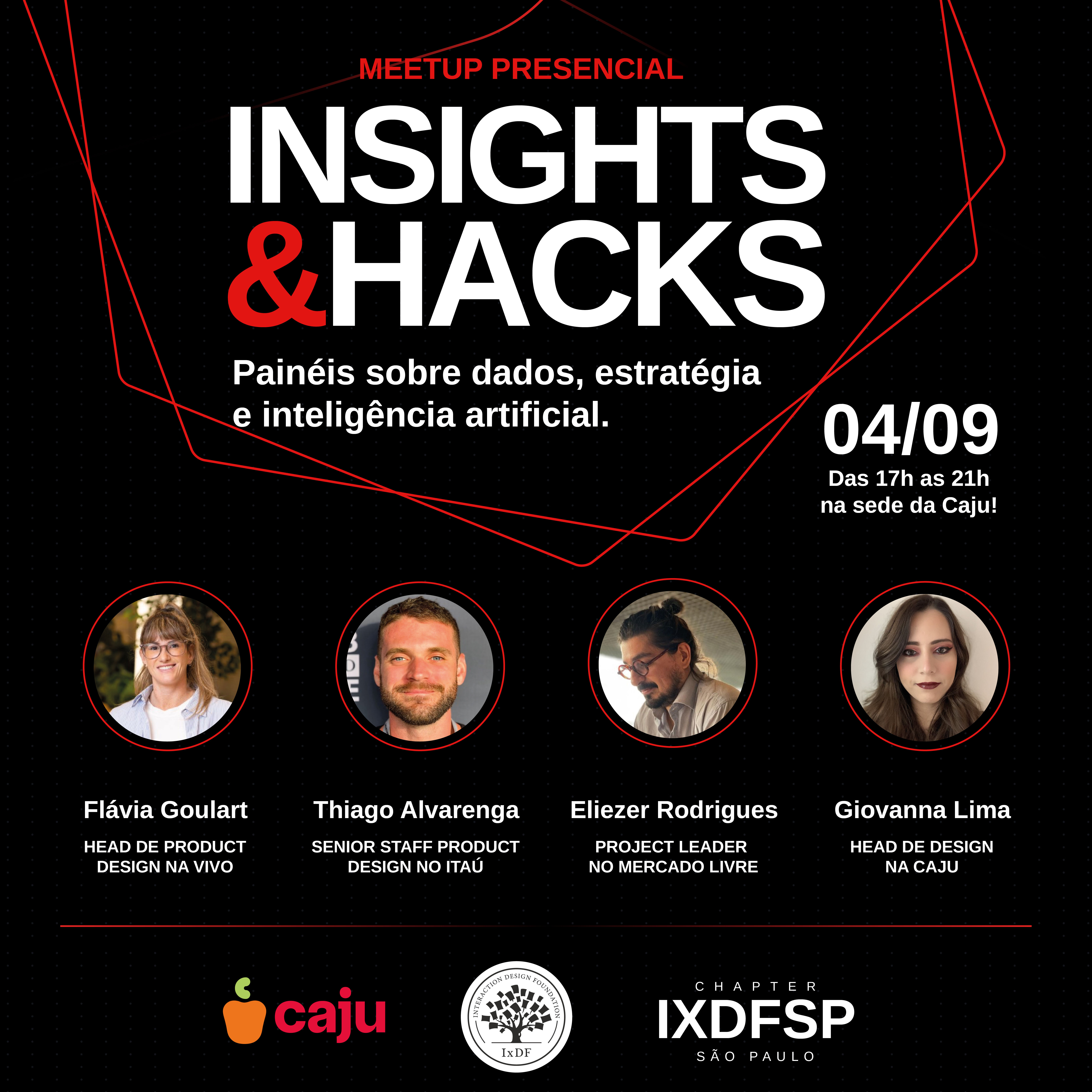 O Insights & Hacks é um meetup presencial que combina cases reais, insights práticos e networking de qualidade. Serão 4 palestras com profissionais renomados do mercado, seguidas de um debate profundo em formato aquário.