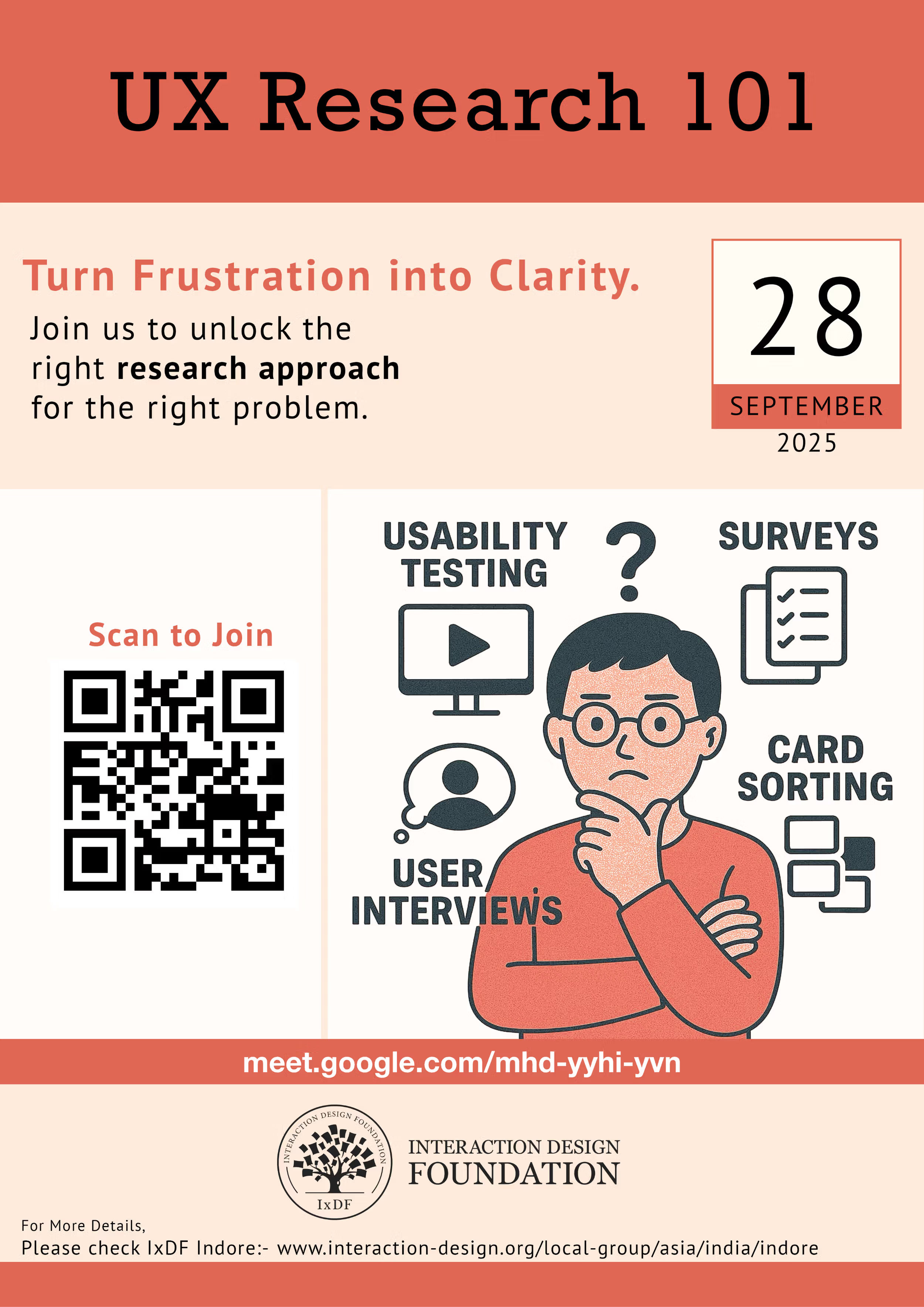 Hi IxDF Ahmedabad, let’s meet online and to discuss how to solve real-world problems by choosing the right research approach. Discover the power of effective UX research to improve your product and user experience.