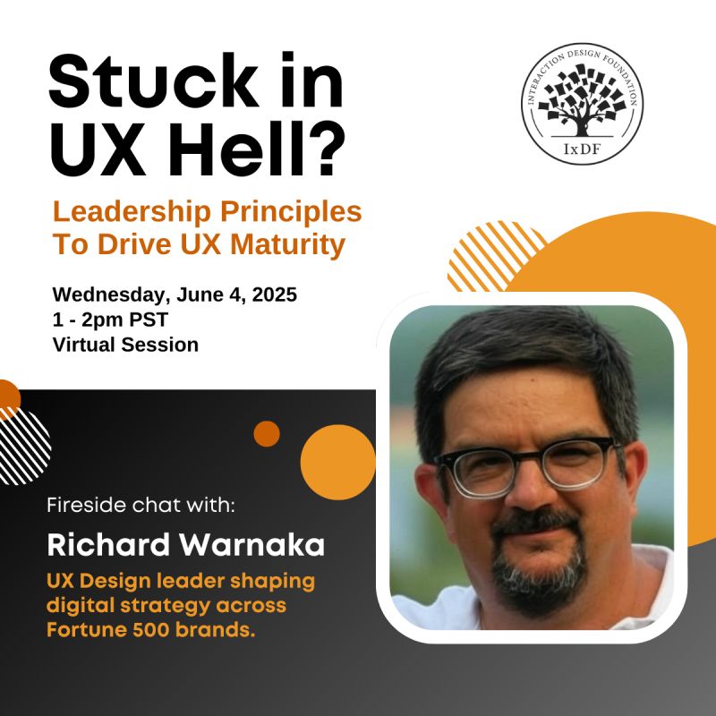 Hi IxDF Seattle, join us for a virtual fireside chat with UX leader Rich Warnaka. Rich will present and talk through practical ways to build influence, shift team mindset, and move the needle on UX maturity, even without a formal title.