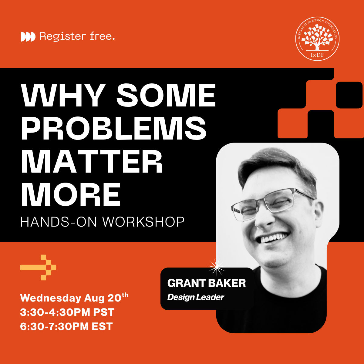 Not all problems are created equal. In this hands-on workshop, design leader Grant Baker will guide participants through the critical first step of any successful design project: Identifying which problems are actually worth solving.