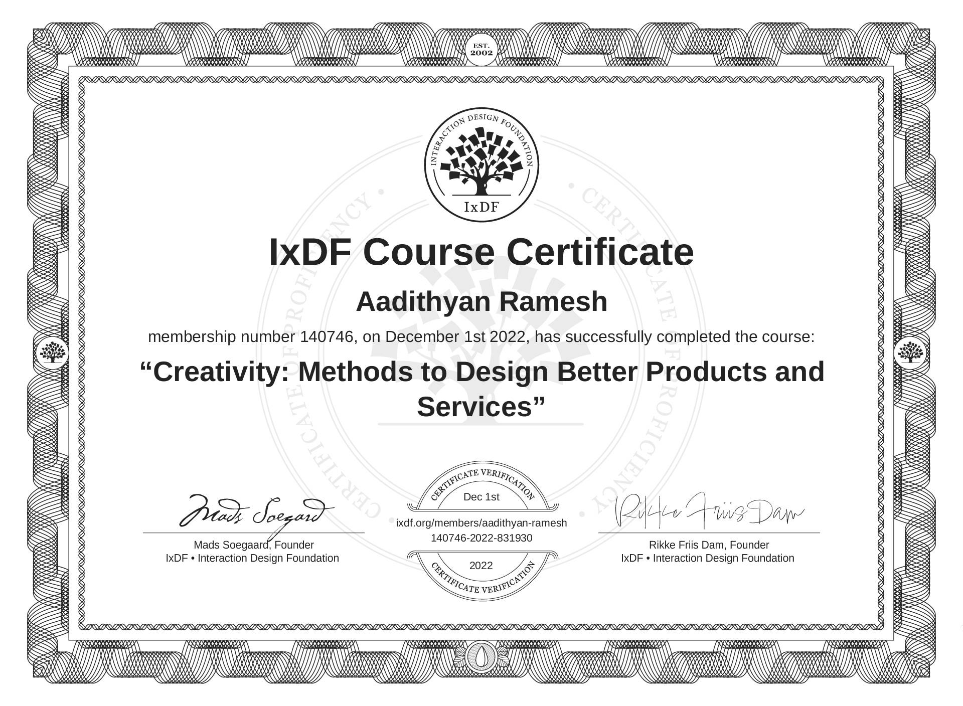 Aadithyan Ramesh's IxDF Course Certificate: Creativity: Methods to Design Better Products and Services