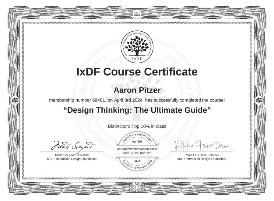 The IxDF Course Certificate above is awarded to Aaron Pitzer with a Top 10% Distinction in formal recognition of their coursework surpassing the rigorous benchmarks of exceptional performance established by the IxDF Educational Codex.