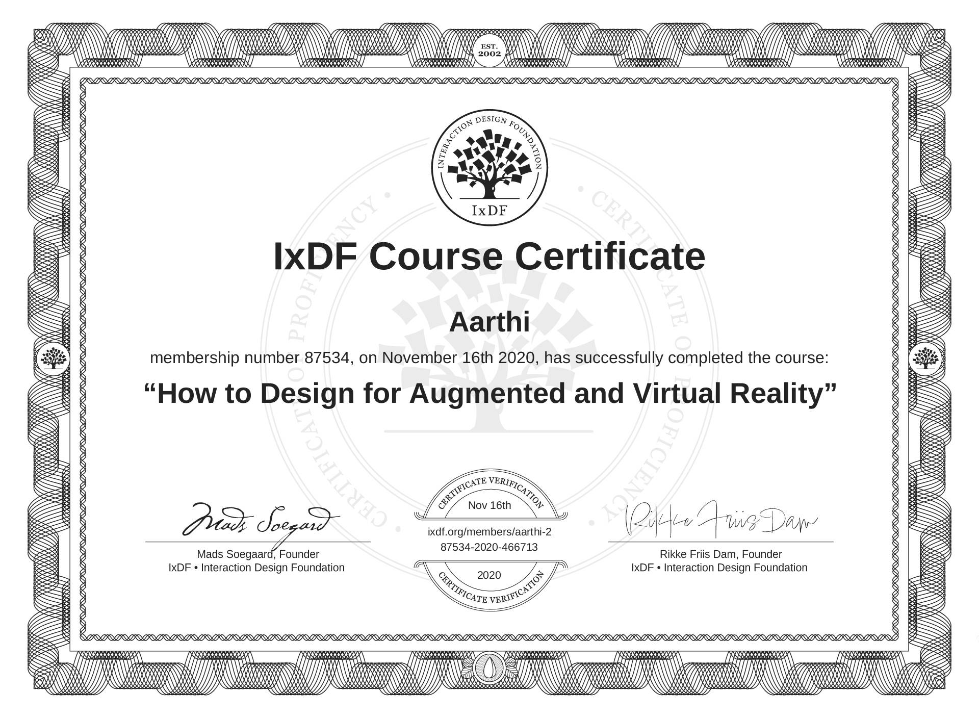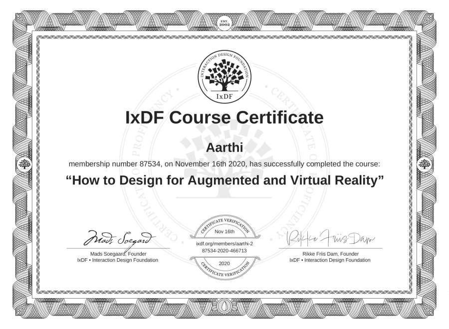 Aarthi's IxDF Course Certificate: How to Design for Augmented and Virtual Reality