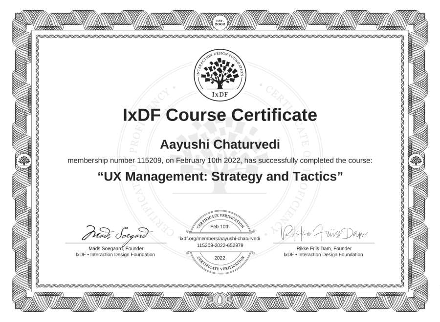 Aayushi Chaturvedi's IxDF Course Certificate: UX Management: Strategy and Tactics