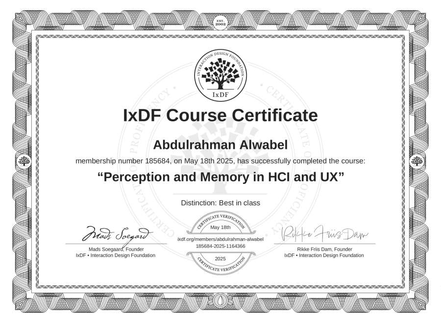 Abdulrahman Alwabel's IxDF Course Certificate: Perception and Memory in HCI and UX