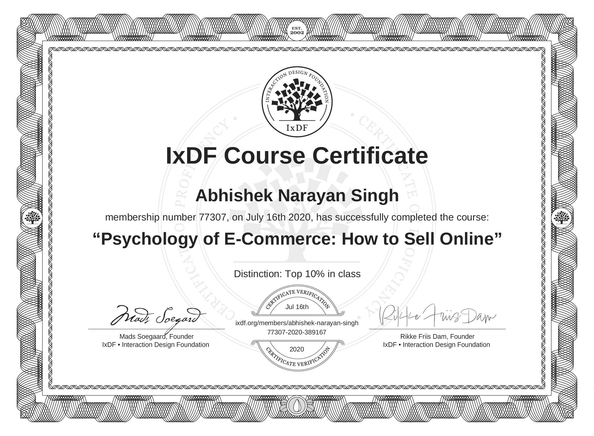 Abhishek Narayan Singh's IxDF Course Certificate: Psychology of E-Commerce: How to Sell Online