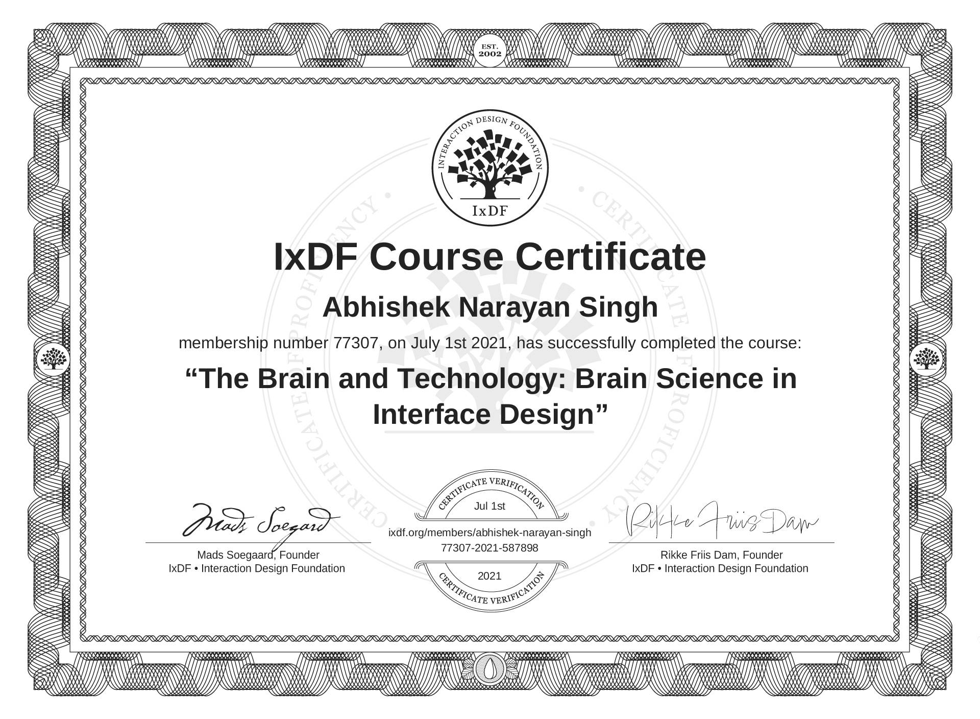 Abhishek Narayan Singh's IxDF Course Certificate: The Brain and Technology: Brain Science in Interface Design