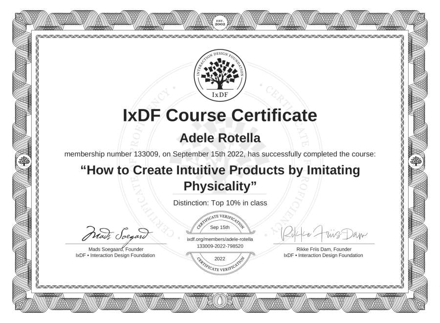 Adele Rotella's IxDF Course Certificate: How to Create Intuitive Products by Imitating Physicality