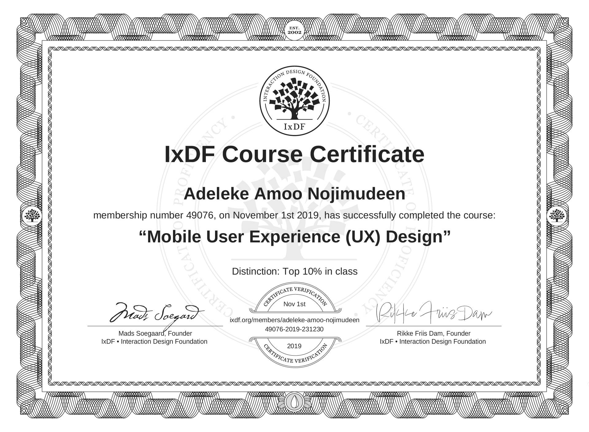 Adeleke Amoo Nojimudeen's IxDF Course Certificate: Mobile User Experience (UX) Design