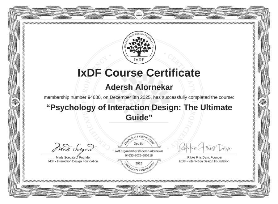 Adersh Alornekar's IxDF Course Certificate: Psychology of Interaction Design: The Ultimate Guide