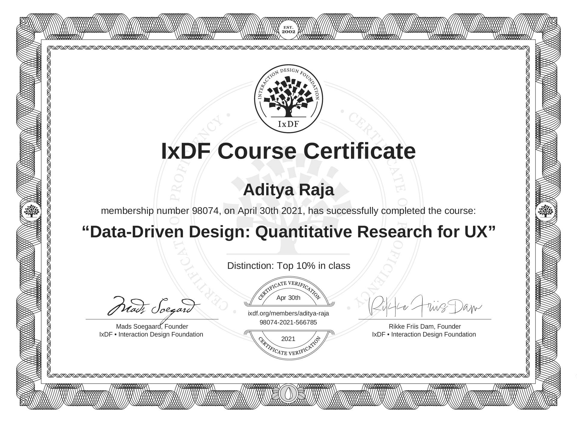 Aditya Raja's IxDF Course Certificate: Data-Driven Design: Quantitative Research for UX