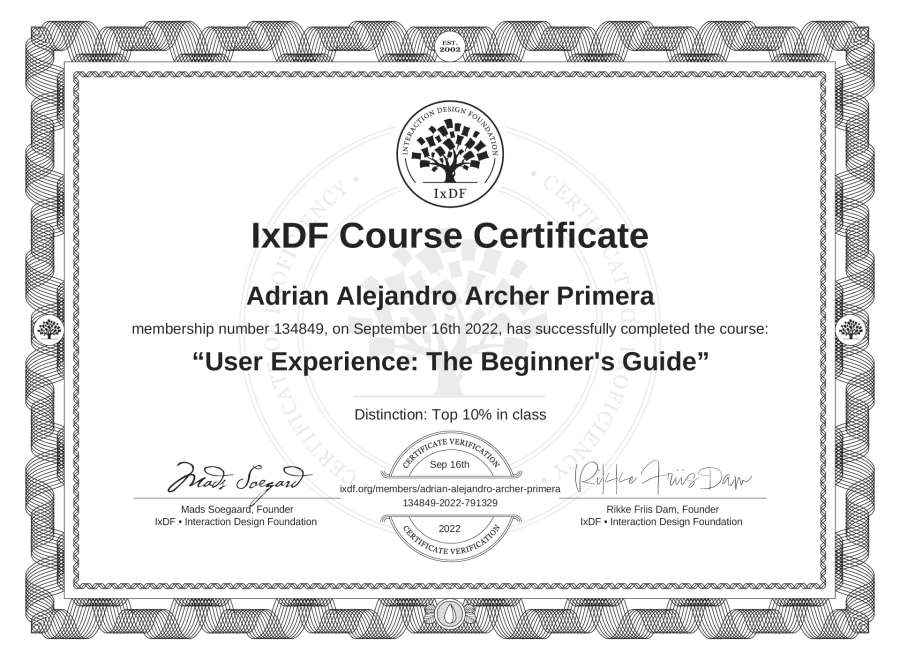 The IxDF Course Certificate above is awarded to Adrian Alejandro Archer Primera with a Top 10% Distinction in formal recognition of their coursework surpassing the rigorous benchmarks of exceptional performance established by the IxDF Educational Codex.
