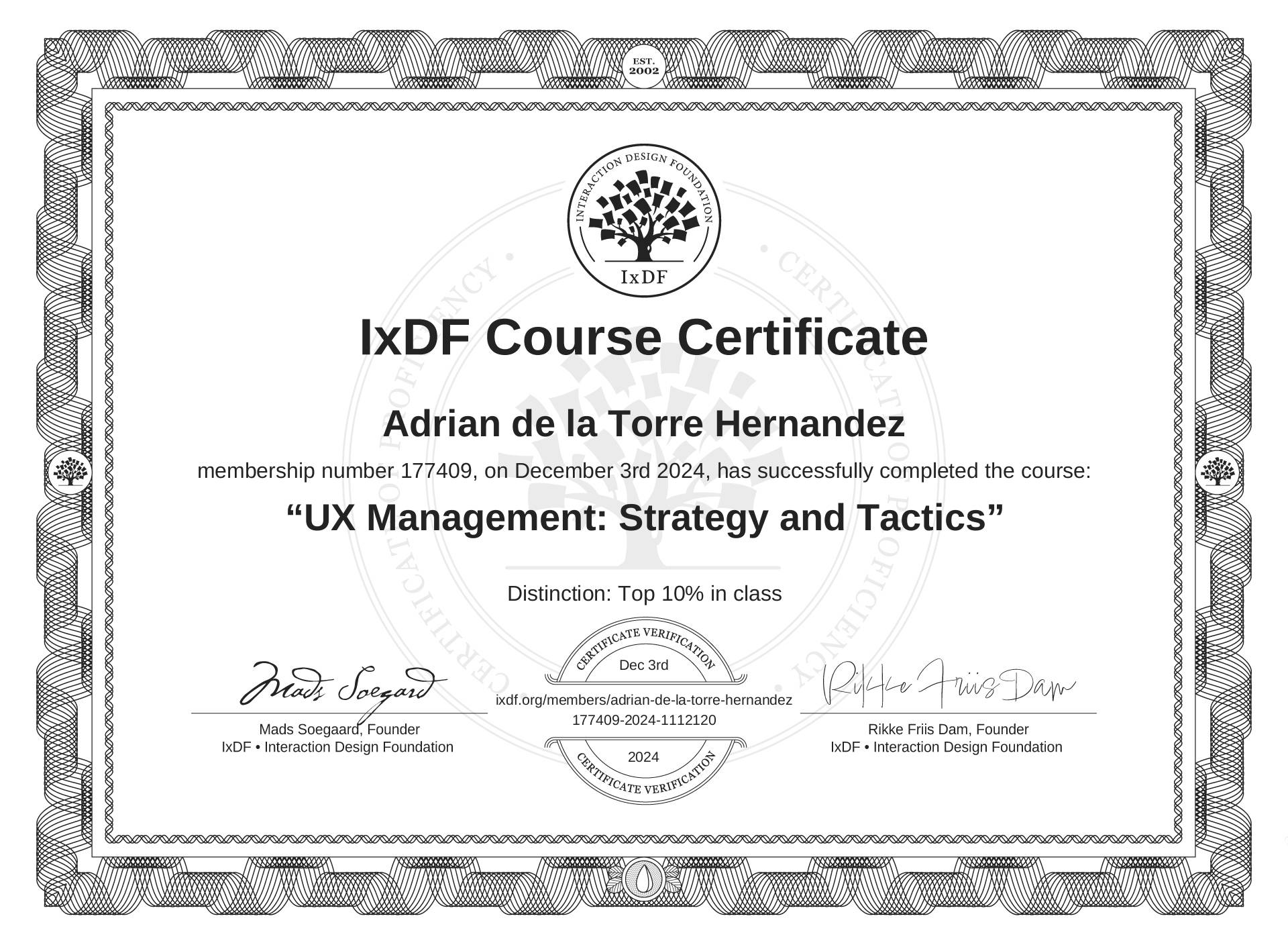 The IxDF Course Certificate above is awarded to Adrián de la Torre Hernández with a Top 10% Distinction in formal recognition of their coursework surpassing the rigorous benchmarks of exceptional performance established by the IxDF Educational Codex.