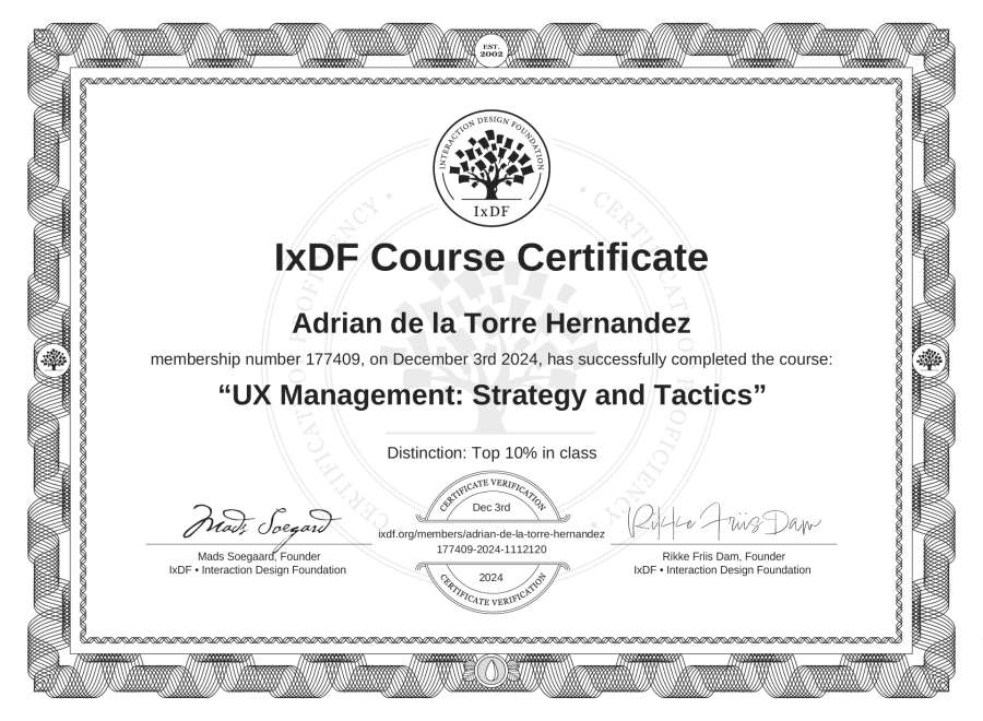 Adrián de la Torre Hernández's IxDF Course Certificate: UX Management: Strategy and Tactics