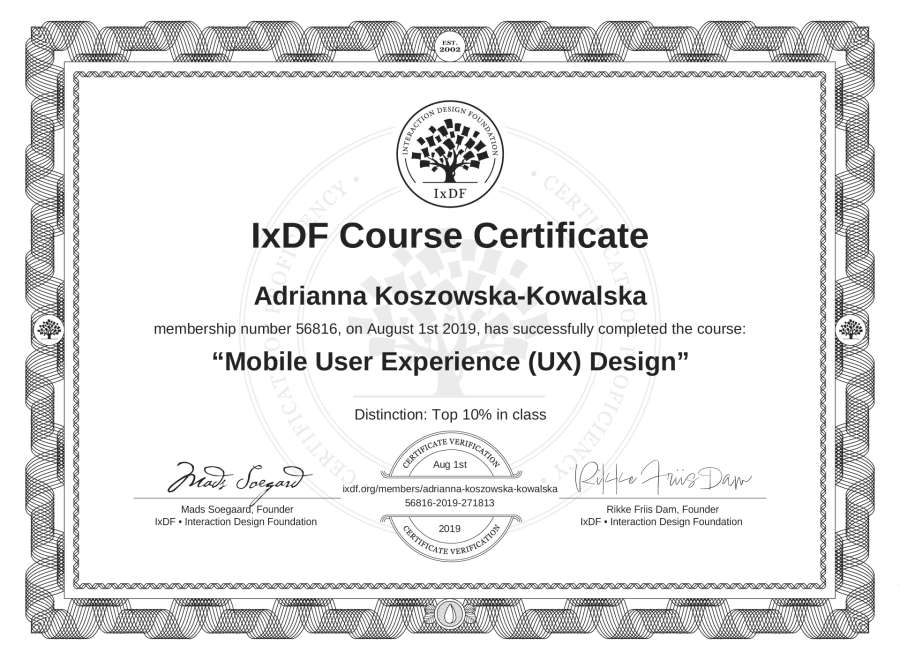 Adrianna Koszowska-Kowalska's IxDF Course Certificate: Mobile User Experience (UX) Design