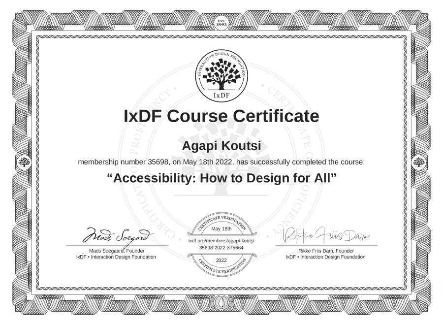 Agapi Koutsi's IxDF Course Certificate: Accessibility: How to Design for All