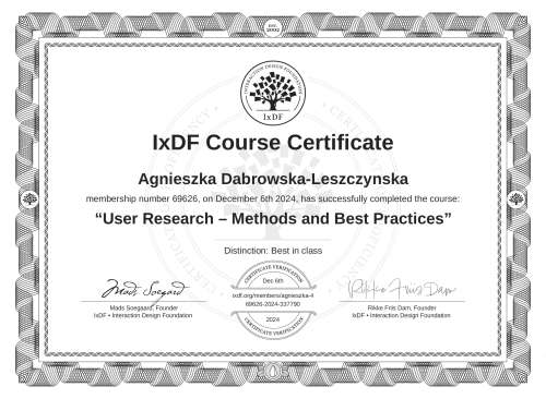 IxDF Course Certificates are awarded to Agnieszka Dabrowska-Leszczynska in formal recognition of their coursework surpassing the rigorous benchmarks of exceptional performance established by the IxDF Educational Codex.