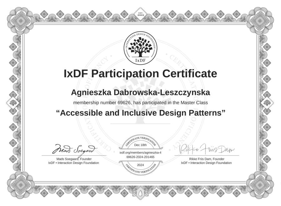 Agnieszka Dabrowska-Leszczynska's IxDF Masterclass Certificate: Accessible and Inclusive Design Patterns