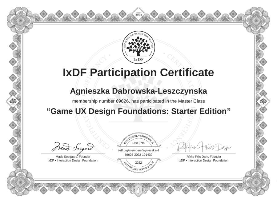 Agnieszka Dabrowska-Leszczynska's IxDF Masterclass Certificate: Game UX Design Foundations: Starter Edition