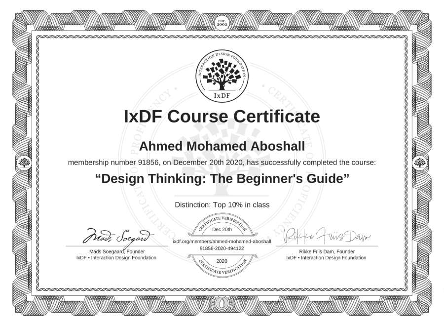 The IxDF Course Certificate above is awarded to Ahmed Mohamed Aboshall with a Top 10% Distinction in formal recognition of their coursework surpassing the rigorous benchmarks of exceptional performance established by the IxDF Educational Codex.