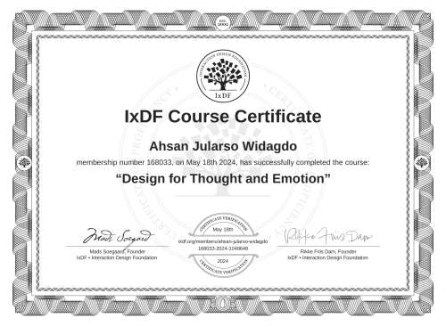 This IxDF Membership Certificate is issued to Ahsan Jularso Widagdo in formal recognition of their membership of the IxDF, global leader in design education.