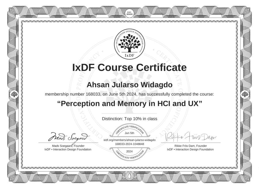 Ahsan Jularso Widagdo's IxDF Course Certificate: Perception and Memory in HCI and UX