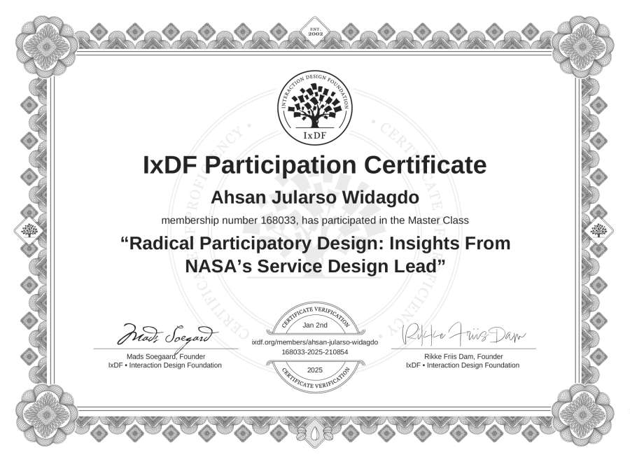 Ahsan Jularso Widagdo's IxDF Masterclass Certificate: Radical Participatory Design: Insights From NASA’s Service Design Lead