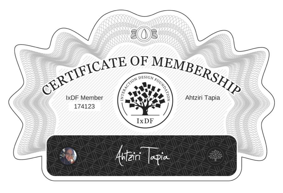 The Membership Certificate below verifies that Ahtziri Tapia is a member of Interaction Design Foundation.