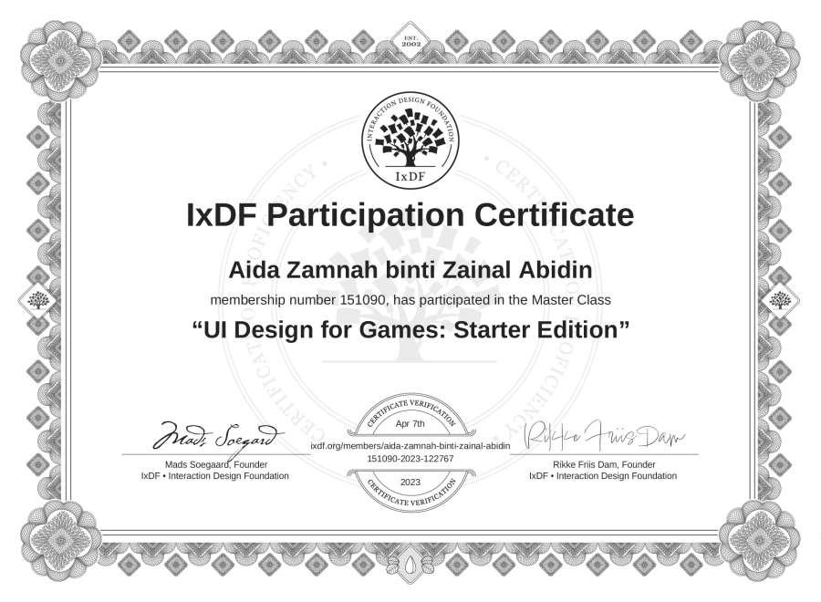 Aida Zamnah binti Zainal Abidin's IxDF Masterclass Certificate: UI Design for Games: Starter Edition