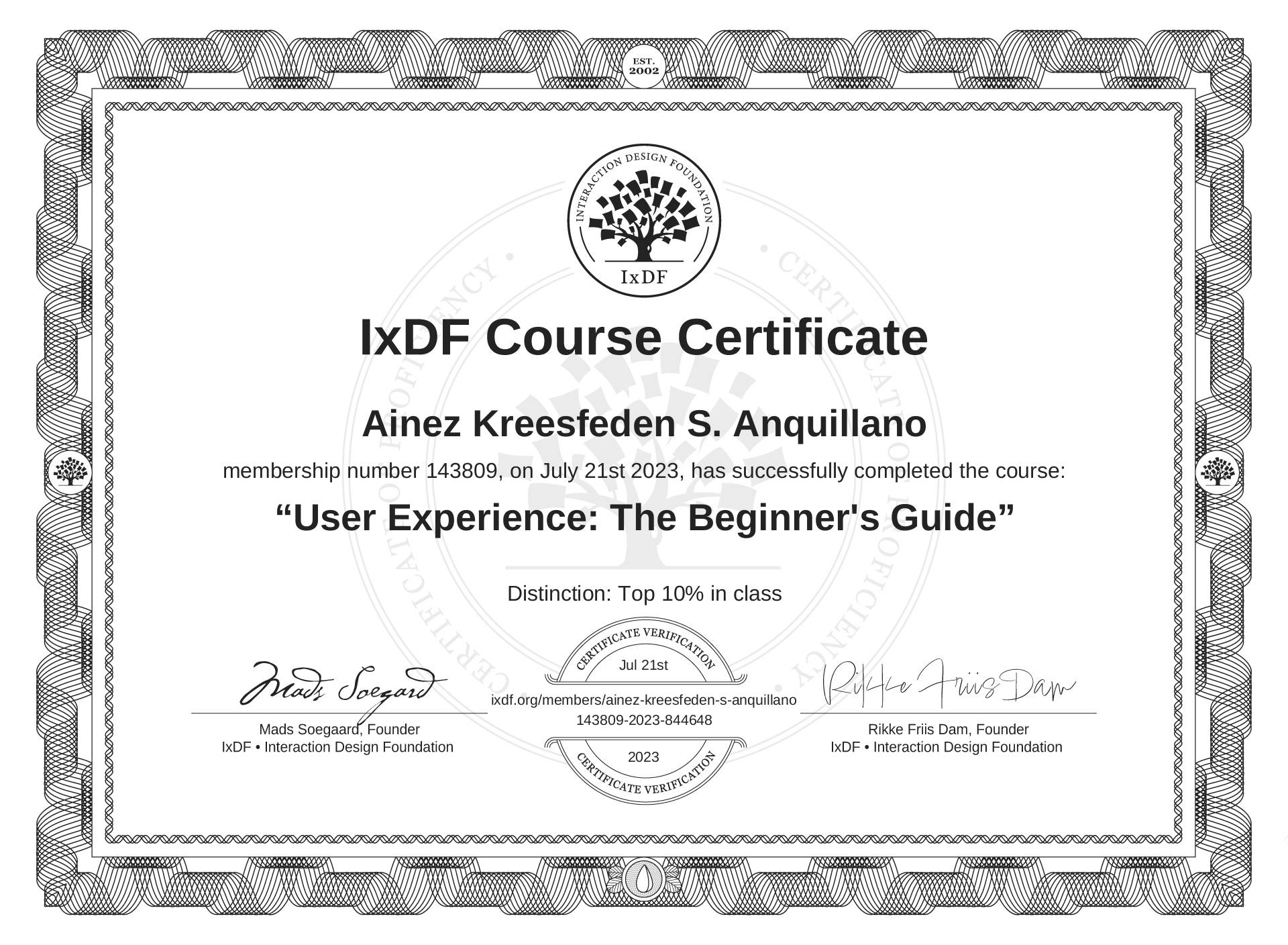 The IxDF Course Certificate above is awarded to Ainez Kreesfeden S. Anquillano with a Top 10% Distinction in formal recognition of their coursework surpassing the rigorous benchmarks of exceptional performance established by the IxDF Educational Codex.