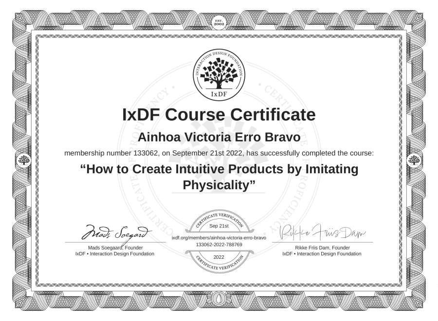 Ainhoa Victoria Erro Bravo's IxDF Course Certificate: How to Create Intuitive Products by Imitating Physicality