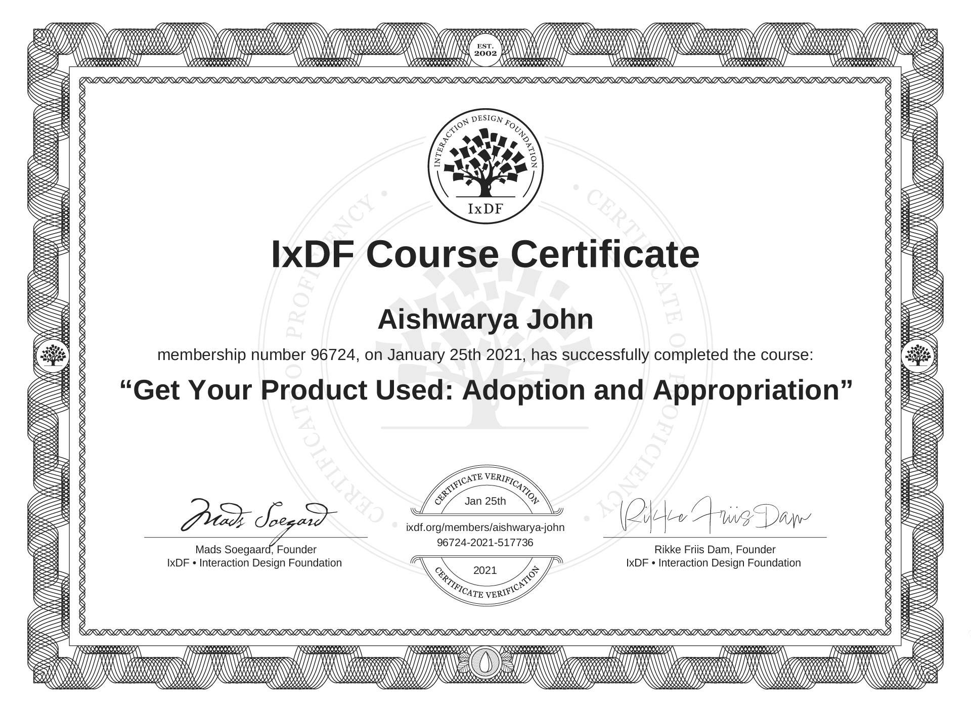 Aishwarya John's IxDF Course Certificate: Get Your Product Used: Adoption and Appropriation