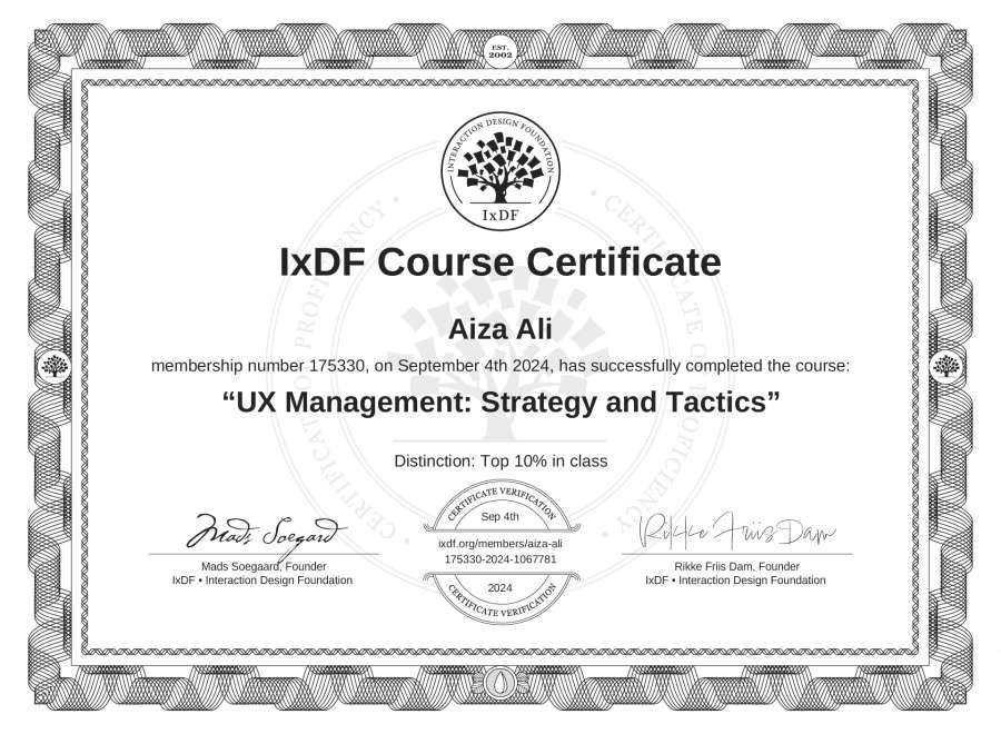 Aiza Ali's IxDF Course Certificate: UX Management: Strategy and Tactics