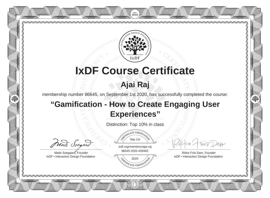 Ajai Raj's IxDF Course Certificate: Gamification - How to Create Engaging User Experiences
