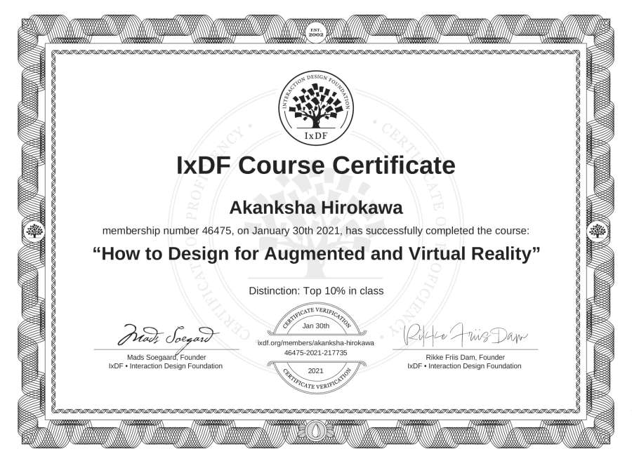 Akanksha Hirokawa's IxDF Course Certificate: How to Design for Augmented and Virtual Reality