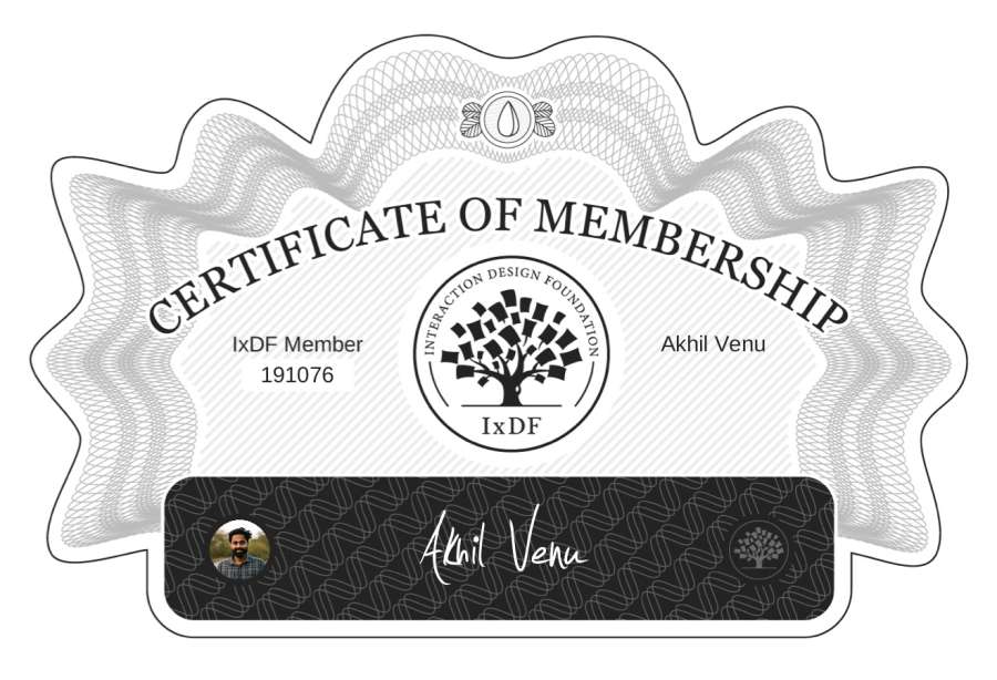The Membership Certificate below verifies that Akhil Venu is a member of Interaction Design Foundation.