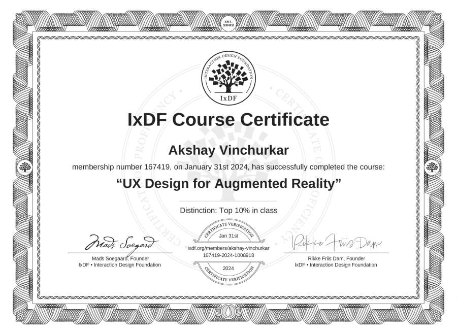 Akshay Vinchurkar's IxDF Course Certificate: UX Design for Augmented Reality