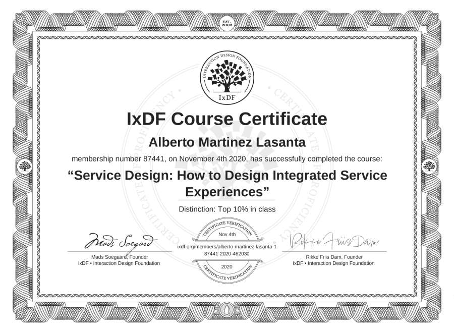 Alberto Martinez Lasanta's IxDF Course Certificate: Service Design: How to Design Integrated Service Experiences