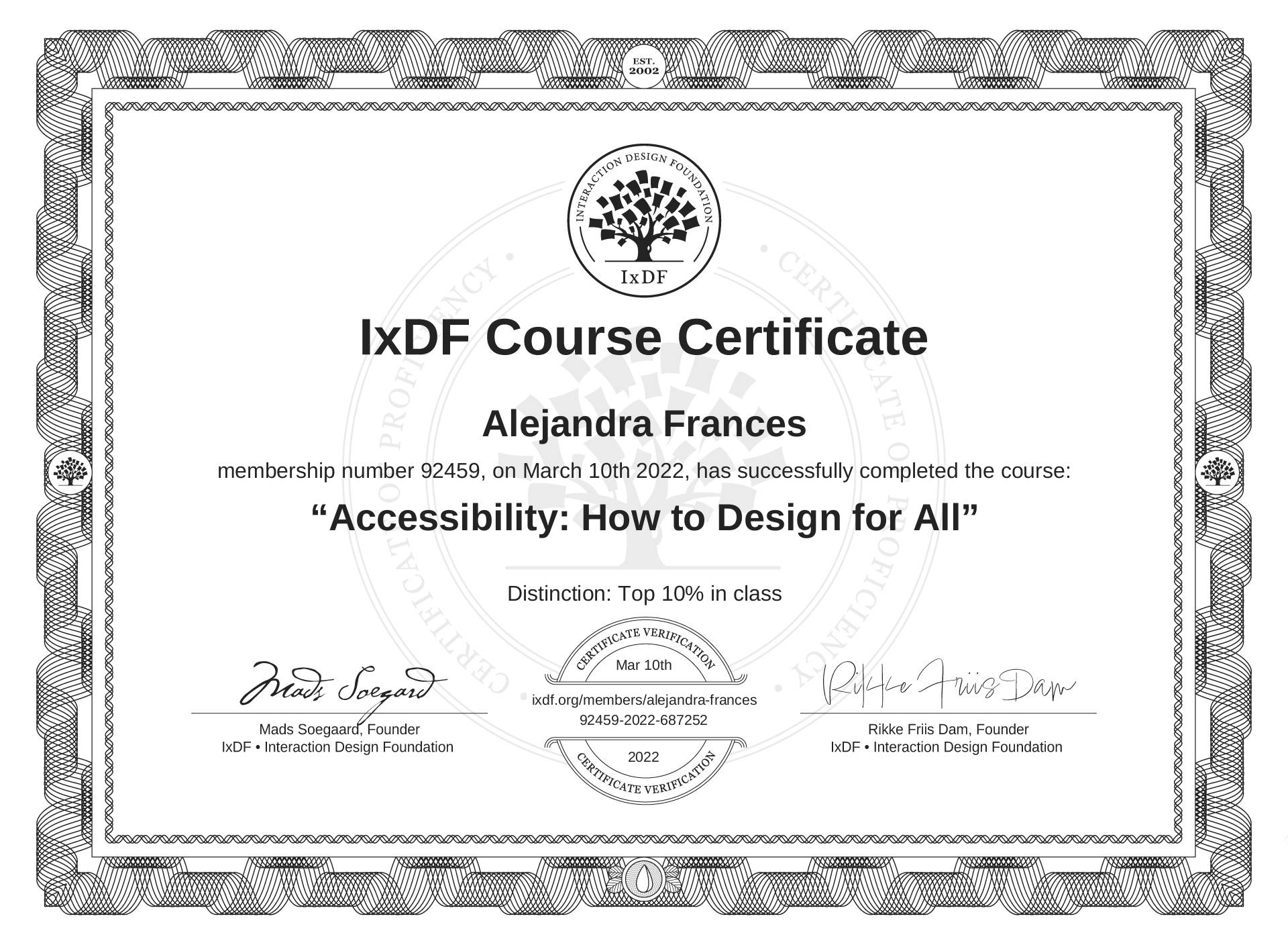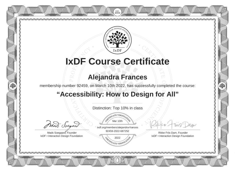 Alejandra Francés's IxDF Course Certificate: Accessibility: How to Design for All