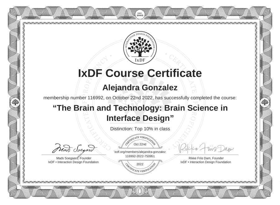 Alejandra González's IxDF Course Certificate: The Brain and Technology: Brain Science in Interface Design