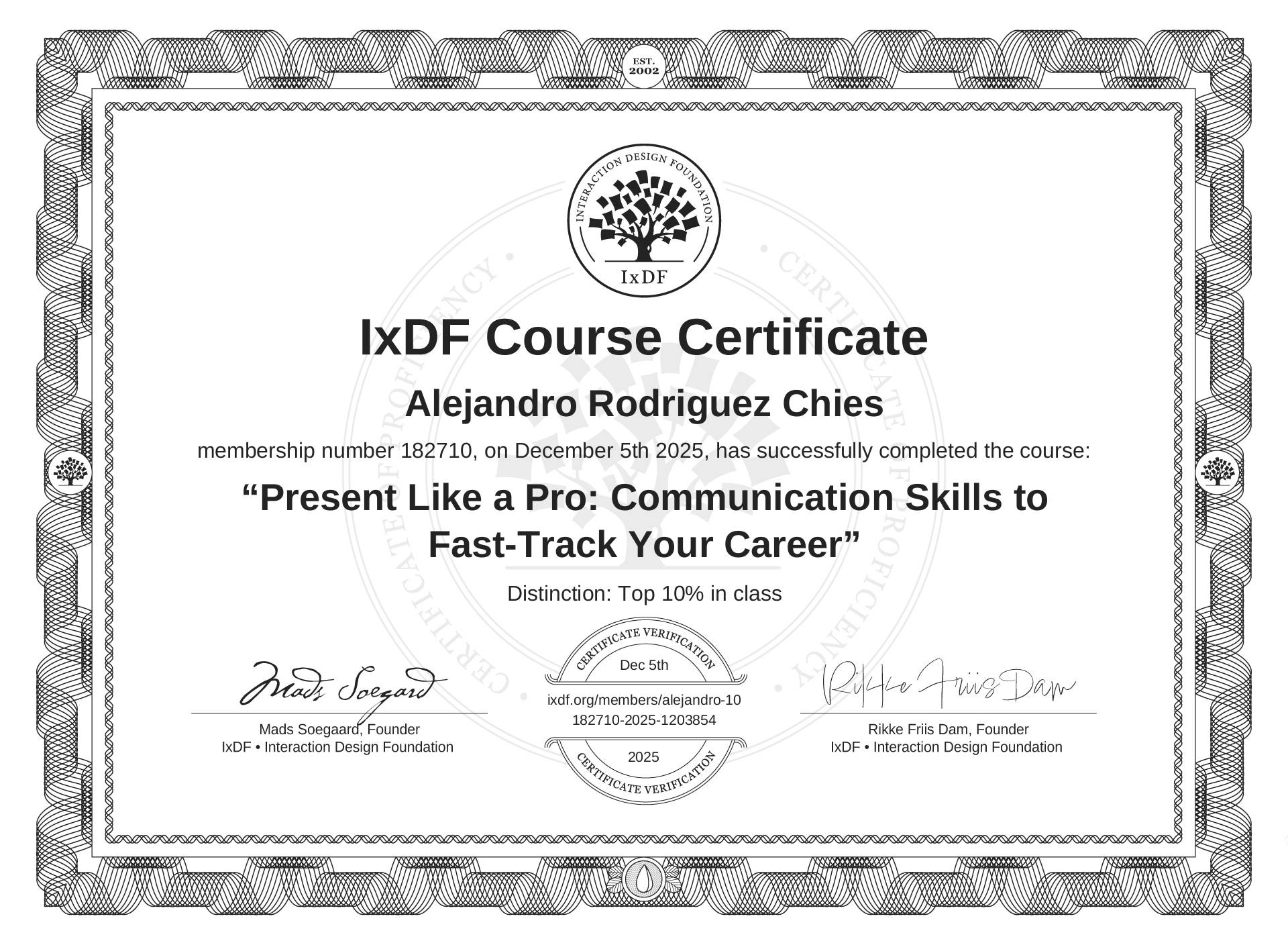 The IxDF Course Certificate above is awarded to Alejandro Rodriguez Chies with a Top 10% Distinction in formal recognition of their coursework surpassing the rigorous benchmarks of exceptional performance established by the IxDF Educational Codex.