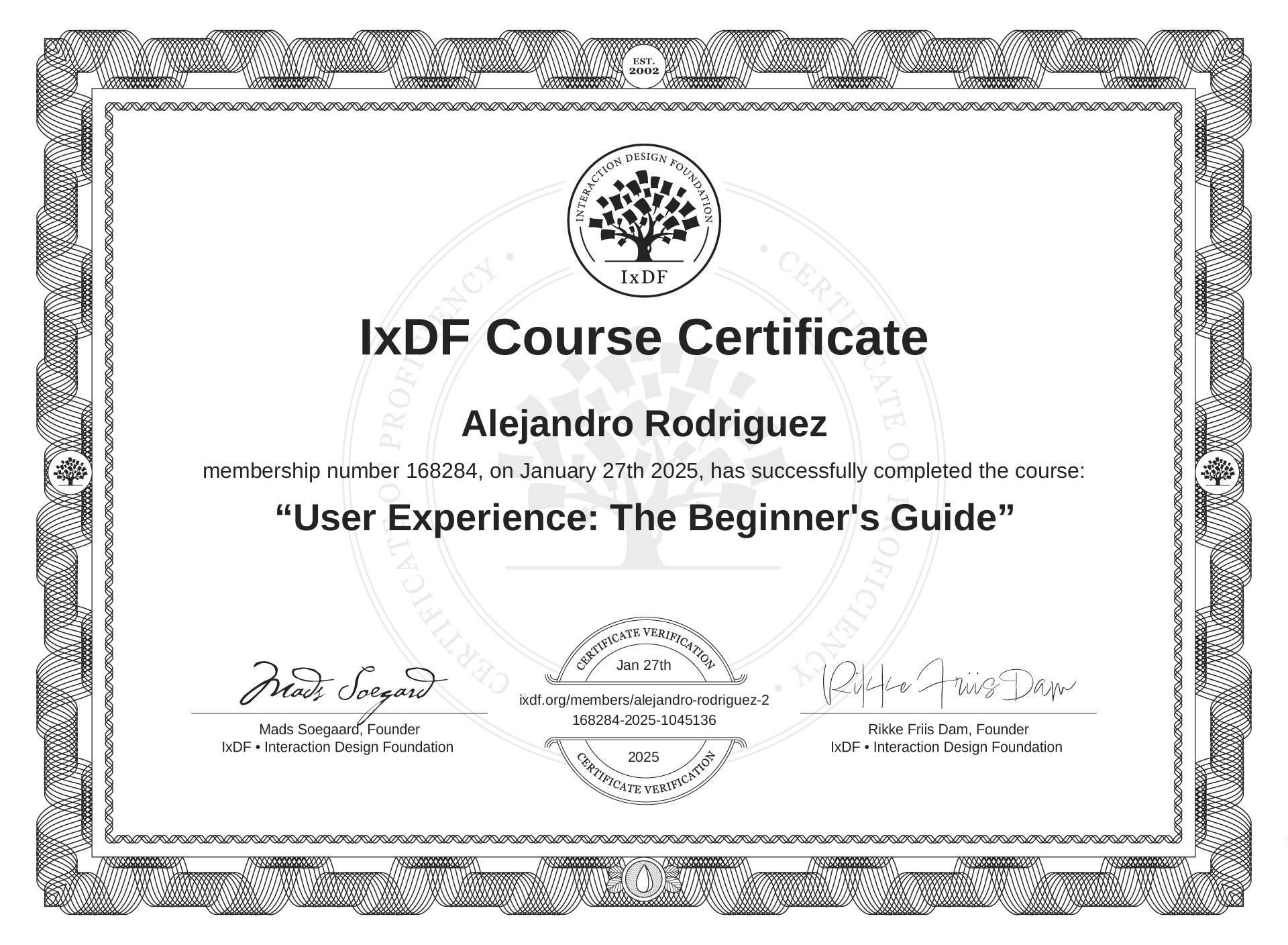 Alejandro Rodríguez's IxDF Course Certificate: User Experience: The Beginner's Guide