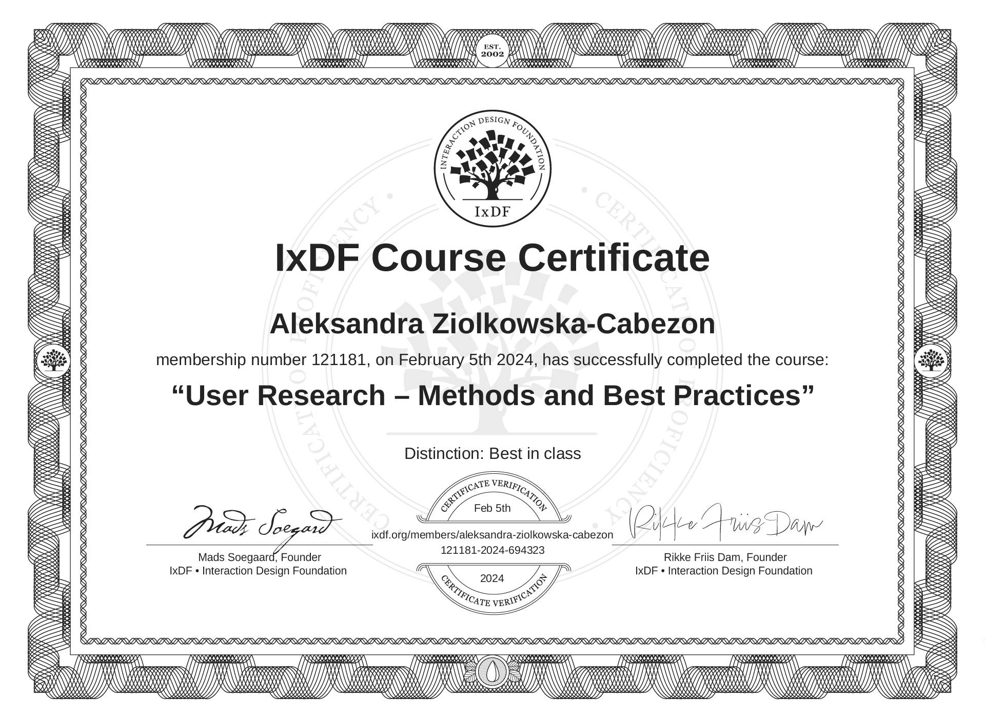 The IxDF Course Certificate above is awarded to Aleksandra Ziółkowska-Cabezón with a Best in Class Distinction in formal recognition of their coursework surpassing the rigorous benchmarks of exceptional performance established by the IxDF Educational Codex.